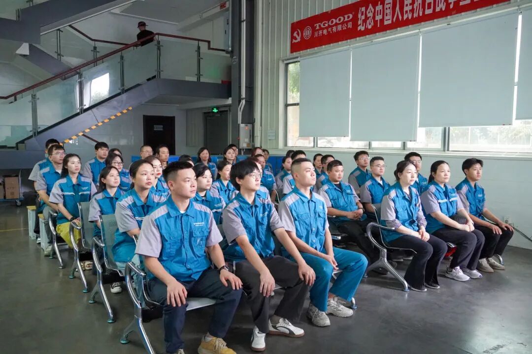 閱兵儀式前,會議室內座無虛席,氣氛莊重肅穆。與此同時,各車間一線也設置了集中觀看點,一線工人們在保障安全生產的前提下,整齊就座,懷著激動的心情等待閱兵儀式的開始。當雄壯的國歌聲響起,主會場和各個車間觀看點的全體員工自發(fā)起立,齊聲高唱國歌,展現了特銳德川開電氣人昂揚向上的精神風貌和深厚的愛國情懷。