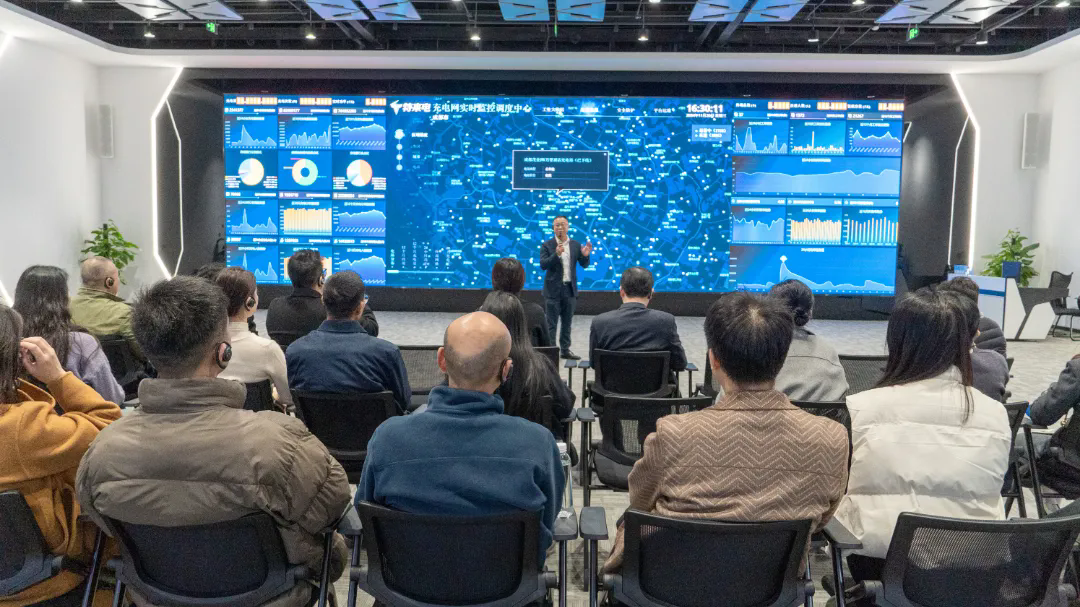 隨后,嘉賓們深入特銳德川開電氣中國新能源生態(tài)科技館,近距離觀摩了特銳德川開電氣智能低壓開關(guān)柜等明星產(chǎn)品,詳細(xì)聽取了特銳德川開電氣的智慧能源管理系統(tǒng)介紹,了解了智能配電網(wǎng)、源網(wǎng)荷儲(chǔ)一體化、多能互補(bǔ)、充電網(wǎng)和儲(chǔ)能網(wǎng)基礎(chǔ)設(shè)施建設(shè)及虛擬電廠等方面的成果,并在5D能量魔方中感受科技新力量,探索未來能源城市。在科技館的多功能廳內(nèi),四川特來電總經(jīng)理武果詳細(xì)介紹了特來電數(shù)據(jù)大屏。