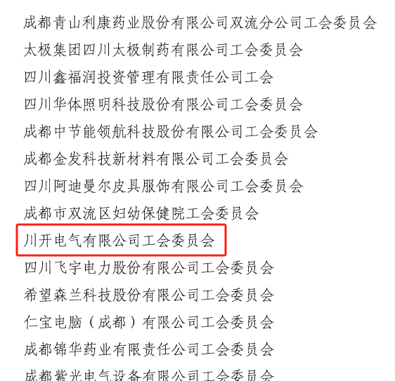 近日,成都市總工會(huì)通報(bào)了2023年四、五星級企事業(yè)單位工會(huì)和四、五級鎮(zhèn)(街道)、產(chǎn)業(yè)園區(qū)工會(huì)評定結(jié)果,川開電氣有限公司工會(huì)委員會(huì)通過了2023年成都市五星工會(huì)評定,光榮入選五星級最高級別企事業(yè)工會(huì)名單。