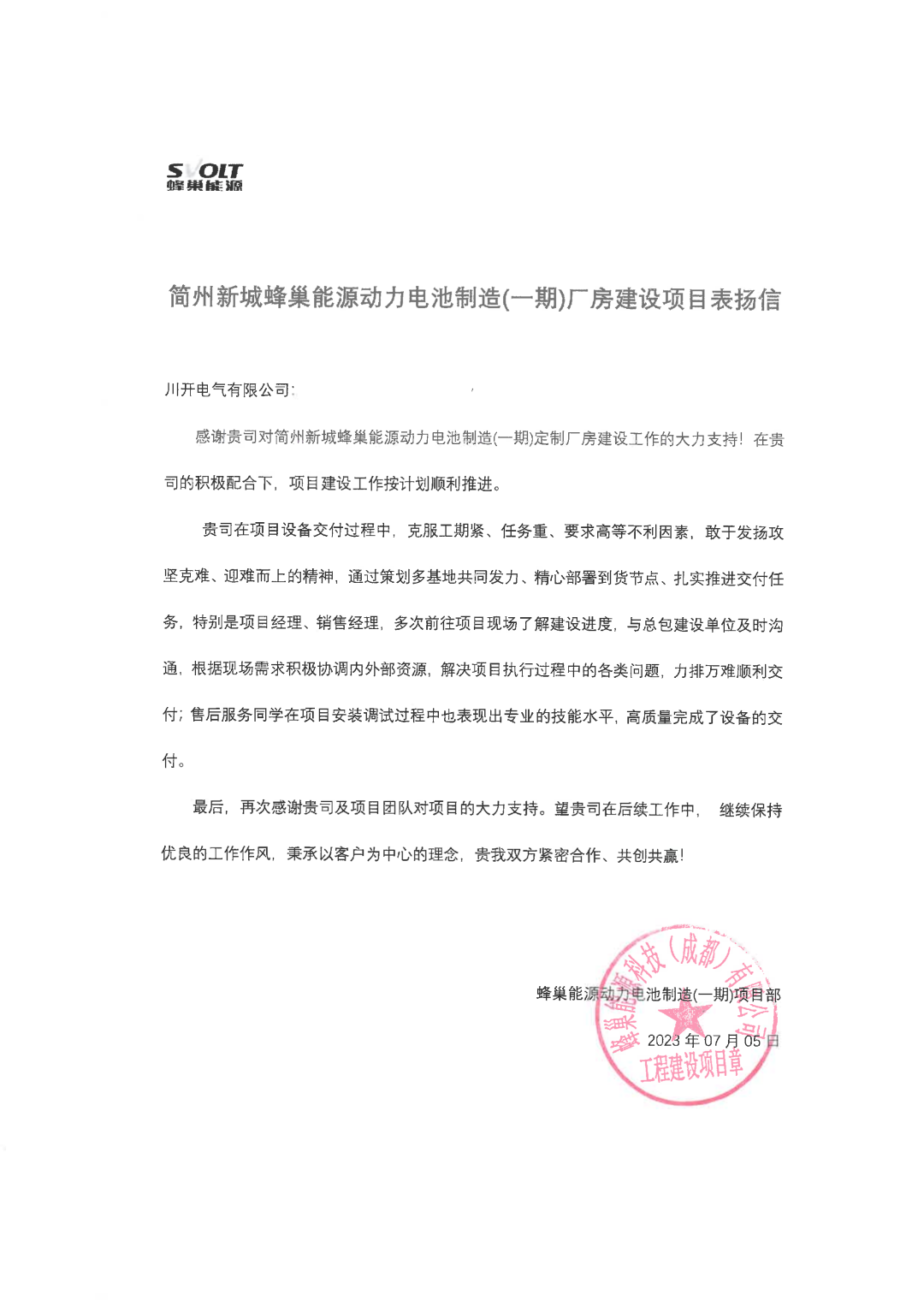 近日,特銳德川開(kāi)電氣助力簡(jiǎn)州新城蜂巢能源動(dòng)力電池制造(一期)廠房建設(shè)項(xiàng)目,順利完成產(chǎn)品交付。