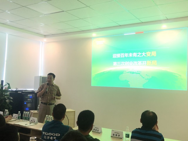 ????? 干部和骨干是公司工作中上上下下的核心紐帶,是公司實(shí)現(xiàn)戰(zhàn)略目標(biāo)的中堅(jiān)力量,如何正確理解并傳達(dá)公司戰(zhàn)略和目標(biāo)?下午13:30分,川開電氣董事長李軍以《迎接百年未有之大變局,第三次創(chuàng)業(yè)改革開新局》為主題與全體與會人員開展了關(guān)于趨勢、戰(zhàn)略的分享。李軍董事長首先對全體戰(zhàn)友們上半年取得的成績表示肯定,并對大家的無私奉獻(xiàn)表示真摯感謝。接著,他從川開電氣的發(fā)展歷程,每一次的變革和突破都伴隨著看似不可能的目標(biāo)一 一實(shí)現(xiàn)開啟本次分享。