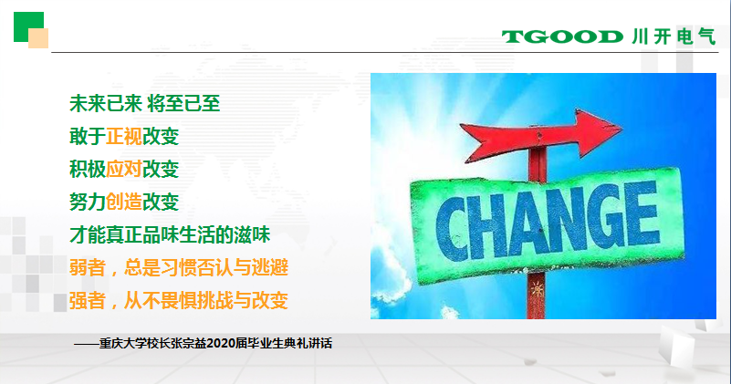 ?????? 通過解讀習(xí)近平總書記6月30日主持召開的中央全面深化改革委員會第十四次會議講話主要精神,李軍董事長強(qiáng)調(diào),在智慧工廠變革的過程中,我們要找到方法,先執(zhí)行固化,然后再優(yōu)化,堅(jiān)持標(biāo)準(zhǔn)絕不讓步,持續(xù)改進(jìn)工作過程中的必有思考,發(fā)揮集體智慧,全員參與。要對發(fā)展趨勢有認(rèn)知,以能力中心為導(dǎo)向構(gòu)建企業(yè)立體式生態(tài)圈,用企業(yè)能力推動企業(yè)發(fā)展戰(zhàn)略。在推動智慧工廠項(xiàng)目落地,忘記經(jīng)驗(yàn)、不解釋、不講條件、不講困難、只找方法,杜絕不可能的思維。因?yàn)槲覀冊诟傻木褪菍?shí)現(xiàn)很多我們以前認(rèn)為不可能的事情,是改革,是突破,是顛覆!最后,李軍董事長借重慶大學(xué)校長張宗益在2020屆畢業(yè)生典禮中的講話——“敢于正視改變,積極應(yīng)對改變,努力創(chuàng)造改變,才能真正品味生活的滋味。弱者,總是習(xí)慣否認(rèn)與逃避,強(qiáng)者,從不畏懼挑戰(zhàn)與改變”結(jié)束分享。