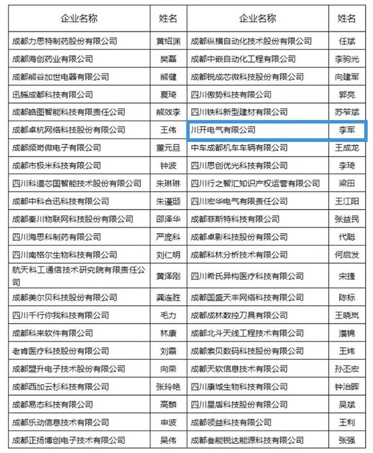 3月28日,2019年成都市新經(jīng)濟企業(yè)梯度培育暨“雙百工程”推進會在成都舉行,2019年度成都市新經(jīng)濟梯度培育企業(yè)及“雙百工程”重點培育企業(yè)和優(yōu)秀人才名單正式出爐。川開電氣有限公司作為“雙百工程”重點培育企業(yè)位列其中,川開電氣有限公司董事長兼總經(jīng)理李軍先生榮獲“雙百工程”優(yōu)秀人才。