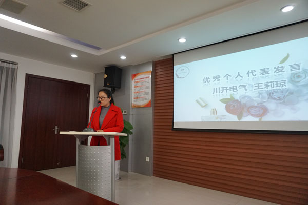 川開(kāi)電氣王莉瓊作為此次優(yōu)秀女職工代表進(jìn)行了發(fā)言。她說(shuō):作為川開(kāi)的一名女職工,我們是幸福的。在工作上,我們與男同胞一起并肩耕耘,揮灑著汗水,擁有同樣廣闊的天地,擁有同樣的平臺(tái),盡情施展著才華,而且我們還得到了比男同胞更多的關(guān)愛(ài)與支持。相信這不僅是她的心聲,更是我們川開(kāi)500多名女職工們共同的心聲。讓我們攜起手共同努力,為川開(kāi)的發(fā)展做出我們應(yīng)有的貢獻(xiàn),展示我們更大的風(fēng)采!