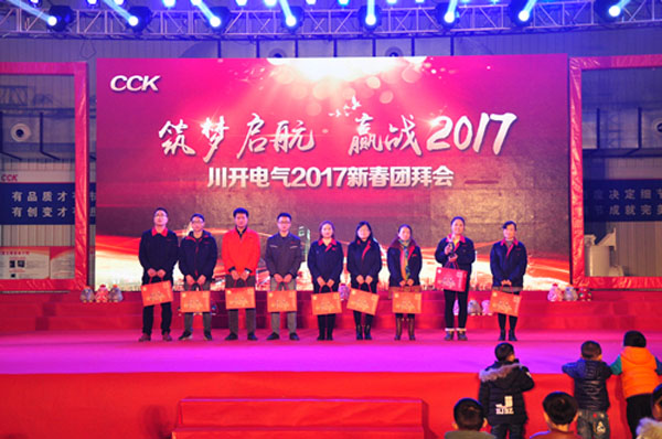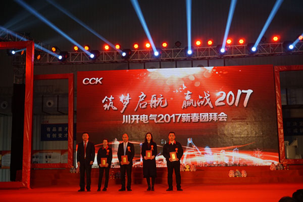 銀猴踏春去,金雞報曉來!又到了辭舊迎新的時刻。川開電氣有限公司迎來了她第三十七個新年。2017年1月24日,川開電氣工業(yè)園內(nèi)張燈結彩,紅火一片,福字圖案簇擁著大紅燈籠,與懸掛在四周的中國結交相輝映,洋溢著一派喜慶的節(jié)日氣氛。大家相約相聚在 “川開電氣2017年新春團拜會”現(xiàn)場,一起 “筑夢啟航 贏戰(zhàn)2017”!