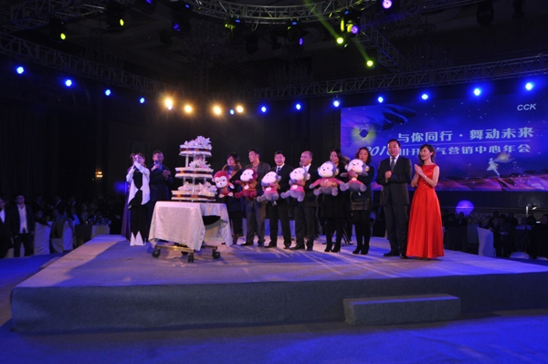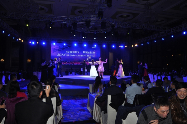 18點38分,一部溫馨感人的川開回憶短片拉開了本次營銷年會的序幕。在營銷中心總監(jiān)岳宏和營銷常務副總監(jiān)李桂英的帶領下,一支由營銷中心行業(yè)總監(jiān)和員工組成的華爾茲舞蹈隊閃亮登場,大家身著華麗禮服,伴著悠揚的旋律和溫柔的燈光翩翩起舞,引來了全場的歡呼和尖叫。舞曲結束后,岳總向到場嘉賓和全體同仁在過去一年中給予營銷中心的支持表示誠摯的感謝,同時倡導大家以更好的狀態(tài)和充足的信心開啟2016。