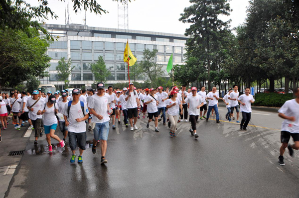 上午7點(diǎn)整,各公司參賽隊(duì)伍準(zhǔn)時(shí)到達(dá)園區(qū)集結(jié),在后勤人員的協(xié)助下有條不紊的進(jìn)行出發(fā)前的各項(xiàng)準(zhǔn)備。本次共有14支隊(duì)伍參賽,每支隊(duì)伍由不低于3位女士的10人組成,其中川開電氣5支參賽隊(duì)。7點(diǎn)30分,隨著集團(tuán)工會(huì)主席李懷玉一聲令下,140余人組成的隊(duì)伍浩浩蕩蕩的沖出起跑線,近15km的戶外徒步正式拉開了帷幕。