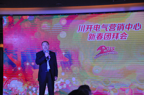 團(tuán)拜會伊始,董事長簡興福先生簡短有力的新年賀詞瞬間讓現(xiàn)場氛圍充滿了正能量。隨后,營銷總監(jiān)岳宏回顧了營銷中心2014 年的心路歷程,肯定了 2014 年所取得的成績。營銷中心一步一個腳印,一年一個新高度,離不開一線員工的辛勤工作和共同努力。一份付出,一份回報(bào),隨著公司營銷體系的不斷建設(shè)和完善,川開電氣營銷中心的未來必將大放異彩。
