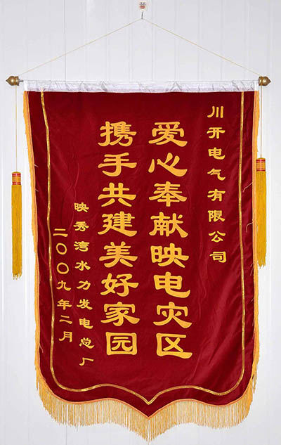 ??? 2009年1月19日,公司組織人員前往映秀灣電廠,除了提供技術服務支持外,還為映秀灣電廠提供了10萬元捐款,以點滴心意援助映秀灣電廠恢復發(fā)電。此舉得到了映秀灣電廠高度贊揚,一副“愛心奉獻映電災區(qū) 攜手共建美好家園”的錦旗表達了映秀灣電廠對川開電氣的深深謝意。