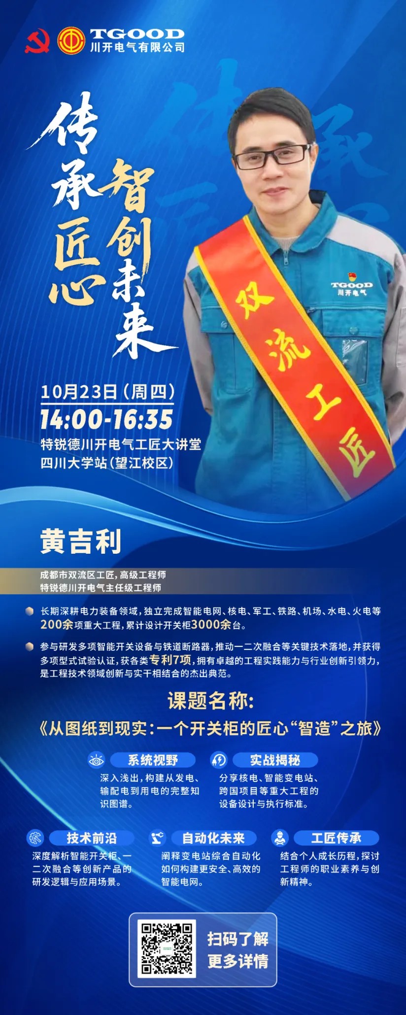 10月23日,以“傳承匠心 智創(chuàng)未來”為主題的特銳德川開電氣45周年工匠大講堂在四川大學(xué)電氣工程學(xué)院首站啟幕,黨員先鋒代表、雙流工匠、特銳德川開電氣技術(shù)高級工程師黃吉利為學(xué)院近60名2022屆本科生帶來了《從圖紙到現(xiàn)實:一個開關(guān)柜的匠心“智造”之旅》工匠講堂。
