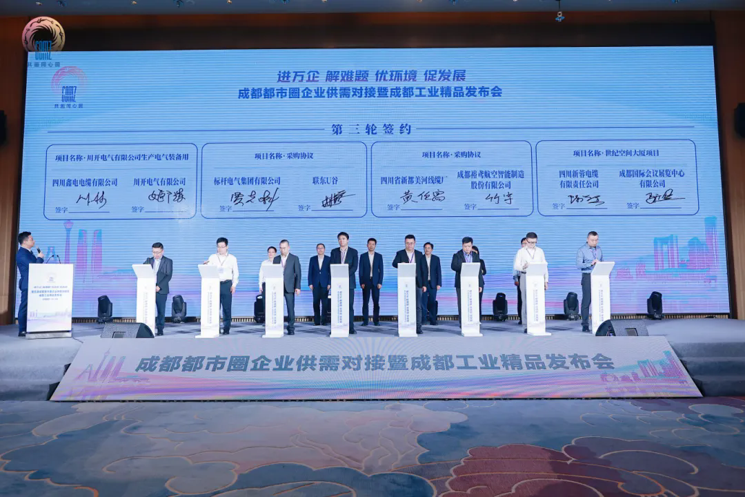 同時,圍繞成都都市圈企業(yè)供需兩端,32家工業(yè)精品企業(yè)和龍頭企業(yè)簽約總金額達10.84億元。其中,特銳德川開電氣與四川鑫電電纜有限公司順利完成了生產(chǎn)電氣裝備簽約。