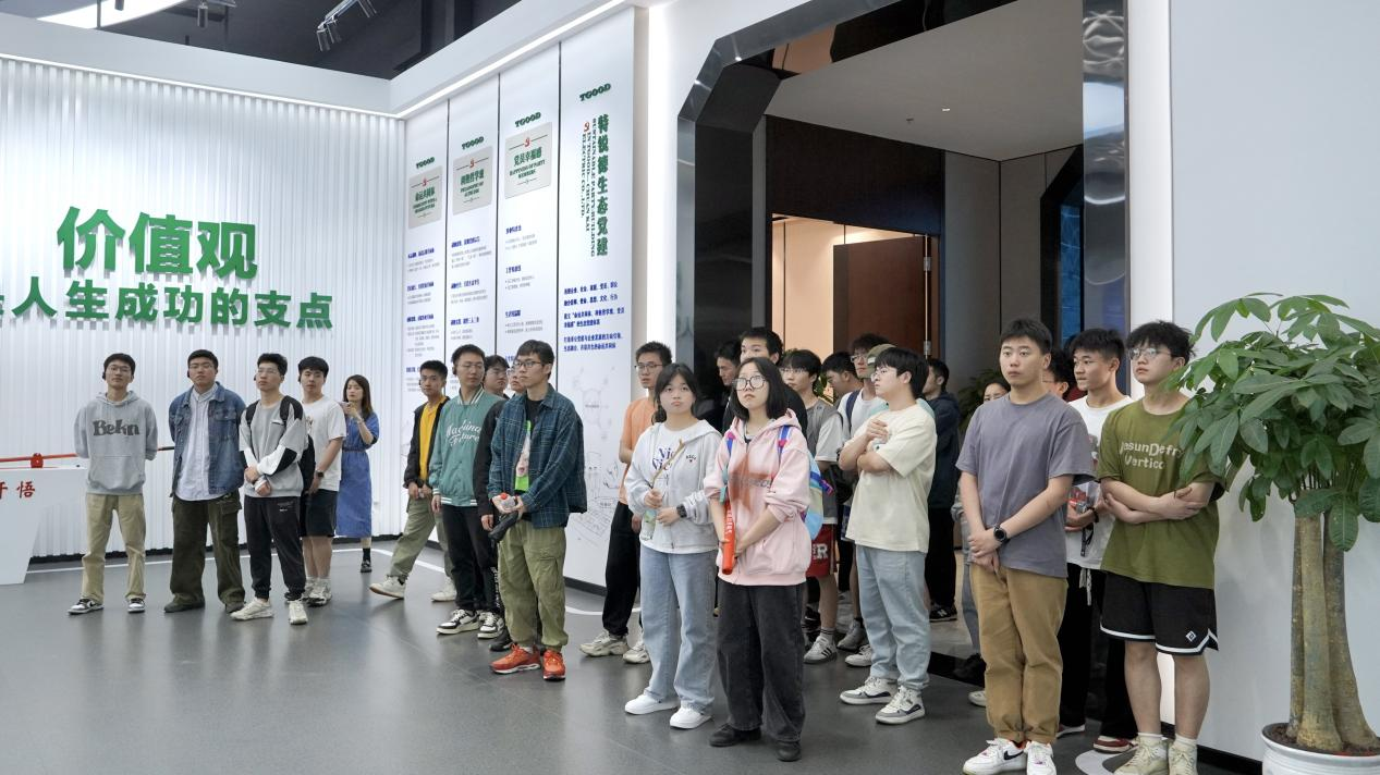 全體師生共同步入特銳德川開電氣的中國新能源生態(tài)科技館與生態(tài)黨建展廳,“人體是最完美的一個系統(tǒng),所以我們用一個奔跑的人,來詮釋我們的生態(tài)黨建。特銳德通過連接企業(yè)、社會、家庭、黨員和群眾,融合信仰、使命、思想、文化和行為,建立“命運共同體、利他哲學觀、黨員幸福感”生態(tài)黨建體系,打造非公黨建與企業(yè)發(fā)展的同心同向、生態(tài)融合、共榮共生的命運共同體?!彪S著科技館講解員的聲聲講解,學子們更加深入地了解了屬于特銳德大家庭的生態(tài)黨建體系,感受到黨建文化與企業(yè)文化融合的意義所在。