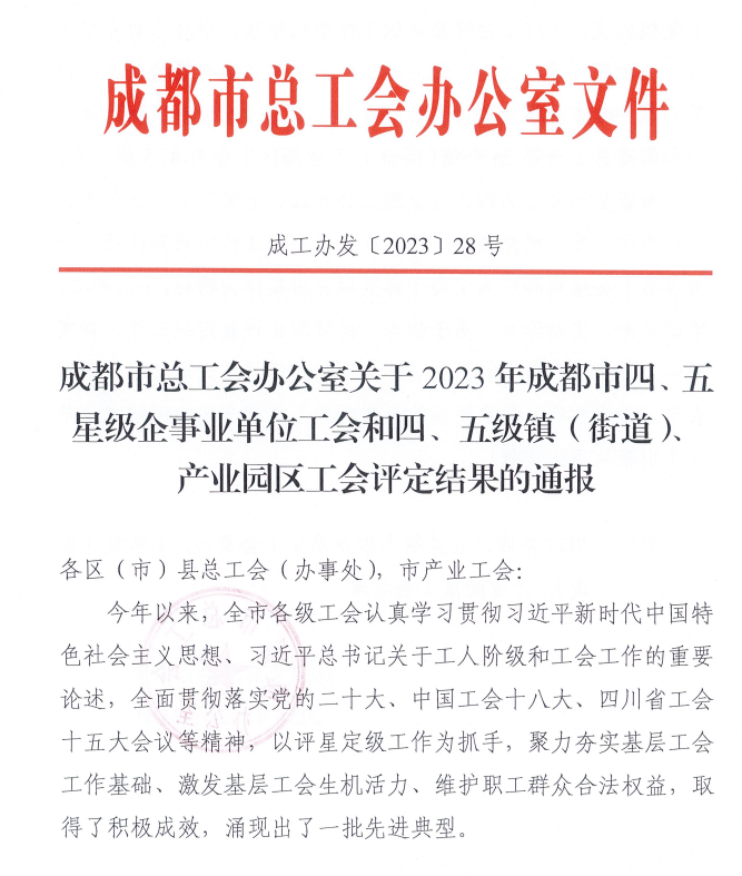 近日,成都市總工會(huì)通報(bào)了2023年四、五星級企事業(yè)單位工會(huì)和四、五級鎮(zhèn)(街道)、產(chǎn)業(yè)園區(qū)工會(huì)評定結(jié)果,川開電氣有限公司工會(huì)委員會(huì)通過了2023年成都市五星工會(huì)評定,光榮入選五星級最高級別企事業(yè)工會(huì)名單。