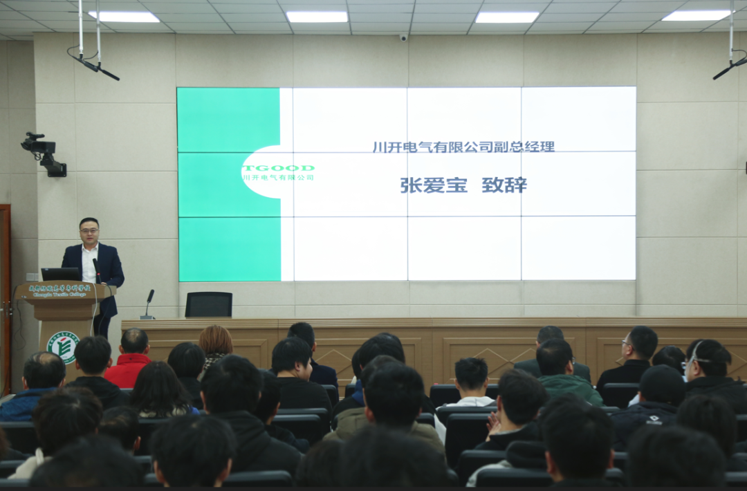 12月12日,?特銳德川開電氣與成都紡織高等專科學(xué)校主導(dǎo)的智能輸配電裝備制造產(chǎn)業(yè)學(xué)院正式揭牌。成都紡織高等??茖W(xué)校黨委常委、紀(jì)委書記張江嬰?yún)⒓訒h并致辭,特銳德川開電氣副總經(jīng)理張愛寶參加會議并講話。學(xué)校相關(guān)職能部門負(fù)責(zé)人、電信學(xué)院全體教師、訂單班學(xué)生、特銳德川開電氣有關(guān)負(fù)責(zé)人參加了本次會議。
