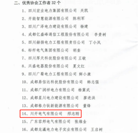 近日,成都電力行業(yè)協(xié)會(huì)第二屆理事會(huì)第六次會(huì)議召開(kāi),會(huì)上公布了2022年優(yōu)秀協(xié)會(huì)工作者名單,川開(kāi)電氣副董事長(zhǎng)邢志剛位列其中。
