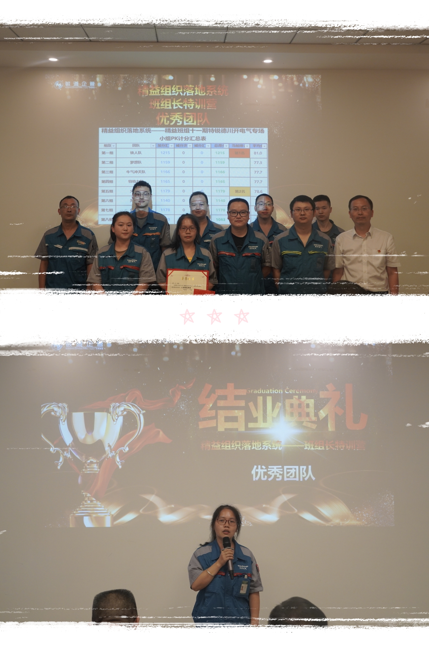 優(yōu)秀個(gè)人獲得者公布之后,接下來公布了在本次班組長(zhǎng)特訓(xùn)營(yíng)中表現(xiàn)優(yōu)秀的團(tuán)隊(duì),獲得優(yōu)秀團(tuán)隊(duì)的是第一組鐵人隊(duì)。優(yōu)秀團(tuán)隊(duì)代表彭容戰(zhàn)友進(jìn)行了發(fā)言,彭容提到優(yōu)秀的團(tuán)隊(duì)從來不是一個(gè)人的努力,而是大家共同的努力造就了一個(gè)優(yōu)秀的團(tuán)隊(duì),很感謝團(tuán)隊(duì)中一起奮斗過的戰(zhàn)友們,更感謝有公司這個(gè)平臺(tái)能夠遇見一群優(yōu)秀的人
