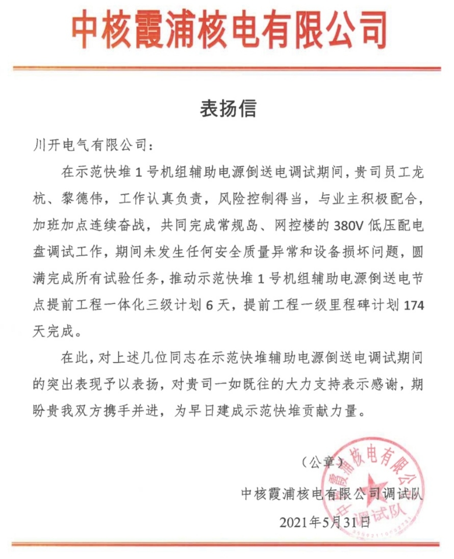 ? ? ? 為此,中核霞浦核電有限公司調(diào)試隊(duì)向公司發(fā)來表揚(yáng)信,對上述兩位戰(zhàn)友在調(diào)試期間的突出表現(xiàn)予以表揚(yáng),同時對公司一如既往的支持表達(dá)感謝。