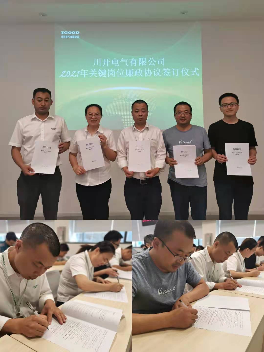宣誓完畢后,會(huì)議舉行了川開電氣有限公司2021年部分關(guān)鍵崗位廉政協(xié)議簽訂儀式,鮮坤城指出,今天只是部分關(guān)鍵崗位簽署廉潔從業(yè)協(xié)議,下來后將全面開展公司所有關(guān)鍵崗位廉潔從業(yè)協(xié)議簽署,相信大家簽署的不僅是一份協(xié)議,幾個(gè)字,簽下的是一份責(zé)任,一份給自己、家人和公司的承諾,希望全體戰(zhàn)友在工作中認(rèn)真履行崗位職責(zé),認(rèn)真遵守承諾,清清白白做人、干干凈凈做事。