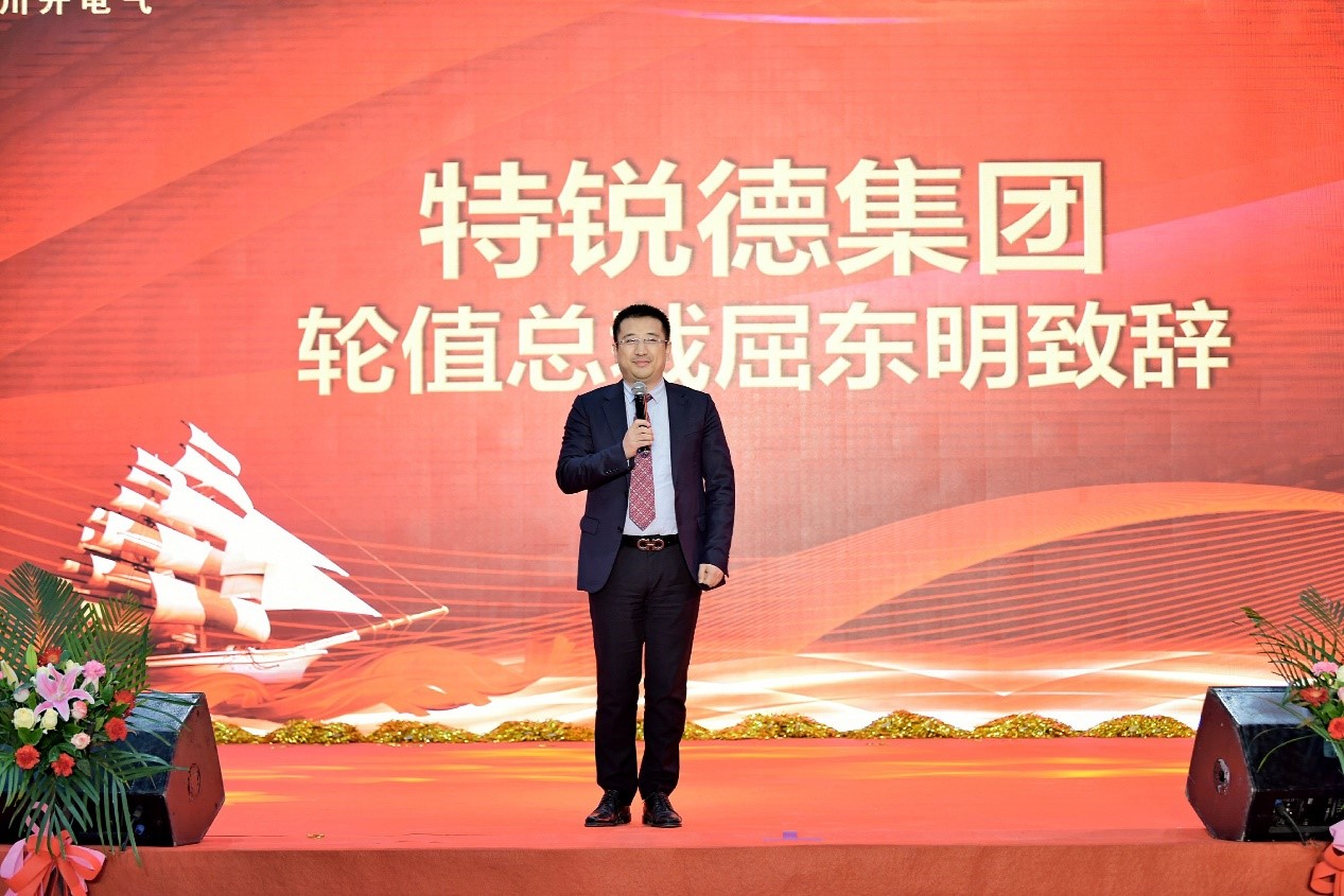 特銳德集團輪值總裁屈東明也代表集團公司董事長于德翔先生及管理層向大家致以了新年的祝福。首先他對全體川開電氣戰(zhàn)友們的辛勤付出表示了肯定,對大家在2019年創(chuàng)造的業(yè)績給予褒獎,也希望在接下來的每一天我們都能蒸蒸日上,奮力拼搏,砥礪前行。
