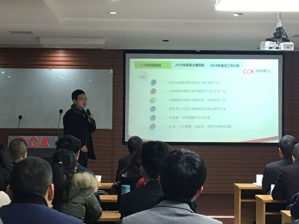 憶往昔崢嶸歲月,川開電氣副董事長(zhǎng)袁會(huì)云在會(huì)議開始后,首先與大家共同回顧了2017年公司各項(xiàng)目標(biāo)指標(biāo)完成情況。在2017年度中我們?cè)谛畔⒒ㄔO(shè)、與集團(tuán)的交流融合以及合同履約管理、精益生產(chǎn)推廣、員工培訓(xùn)提升等方面取得一定成績(jī)。但工作中仍然存在不足,比如創(chuàng)新意識(shí)還不夠,產(chǎn)品、研發(fā)、生產(chǎn)、市場(chǎng)、管理等工作缺乏前瞻性,比較默守陳規(guī);目標(biāo)分解和引導(dǎo)不足;成本意識(shí)還需要提高及SAP上線還需要加強(qiáng)培訓(xùn)等方面。