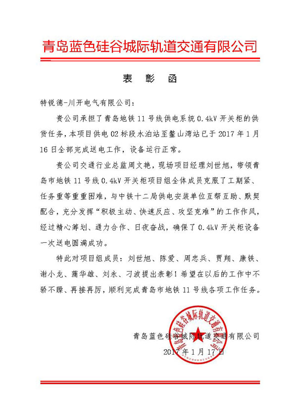 對于此次超高效率的完成任務(wù),青島特銳德集團(tuán)特地對川開電氣駐青島項目同事進(jìn)行了表彰。對大家的努力表示肯定的同時,也希望能夠再接再厲,未來做的更加的出色。