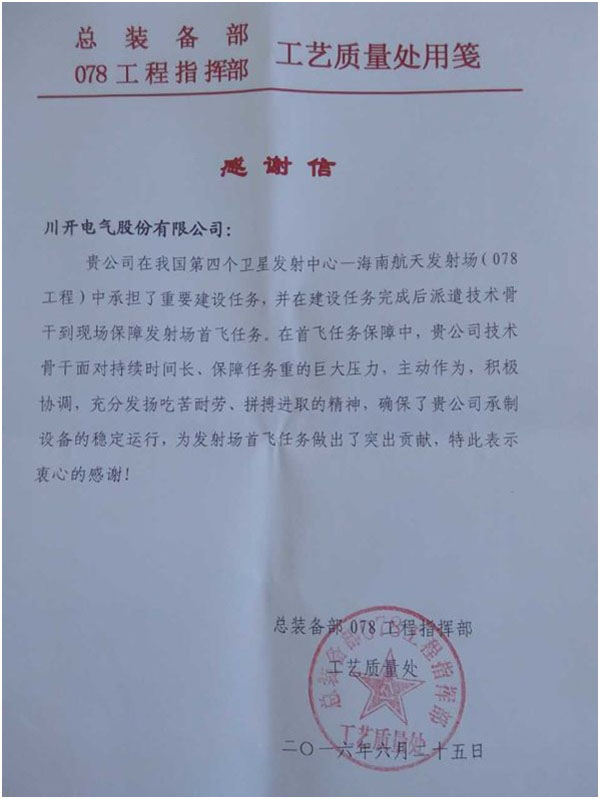 川開電氣作為文昌發(fā)射中心的優(yōu)質(zhì)供應(yīng)商,總共承接了包括發(fā)射區(qū)等多個(gè)變電站的中低壓成套設(shè)備供貨及安裝調(diào)試。自2013年3月25日首批設(shè)備進(jìn)場到2016年6月25日火箭成功發(fā)射,總歷時(shí)39個(gè)月。川開電氣為祖國的航天事業(yè)全力傾情奉獻(xiàn),為長征七號(hào)成功發(fā)射做好輸配電保障。