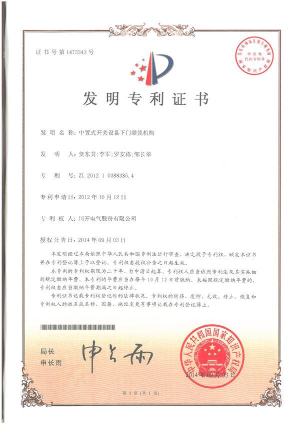 2014年10月20日,我公司獲得由國家知識產(chǎn)權局頒發(fā)的“中置式開關設備下門聯(lián)鎖機構”發(fā)明專利證書,標志著我公司知識產(chǎn)權工作再上新臺階,為知識產(chǎn)權工作樹立了一個里程碑。