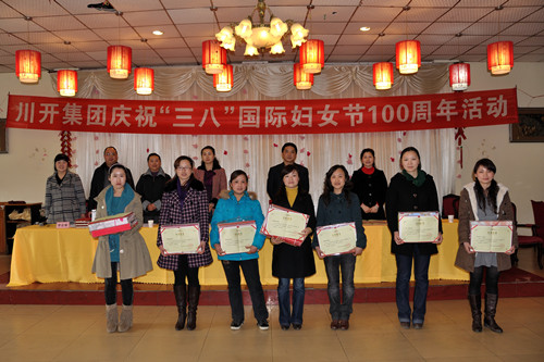 ??? 會議首先由簡興福董事長首先向全體女員工們表示節(jié)日祝福,充分肯定了女員工們?yōu)槠髽I(yè)發(fā)展做出的努力和貢獻(xiàn)并提出新的希望。女工委員會主任趙玲作專題發(fā)言激勵全體女員工要自立、自信、自強,充分發(fā)揮“半邊天”的作用。李會春副主任作《2009年度集團公司婦女工作總結(jié)》。我公司陶厚珍等15名女員工榮獲“川開集團2009年度女標(biāo)兵”稱號并受到表彰,集團總裁王洪先生號召全體女員工以標(biāo)兵和先進(jìn)為楷模,愛崗敬業(yè),為公司發(fā)展做出新的更大貢獻(xiàn)。