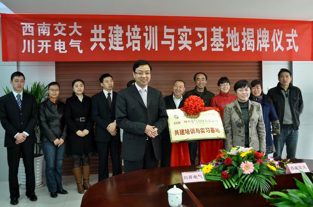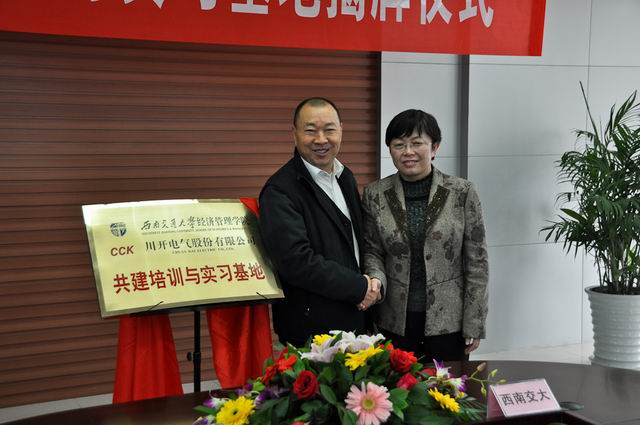??? 最后,李軍書(shū)記與簡(jiǎn)興福董事長(zhǎng)共同揭開(kāi)了“西南交大經(jīng)濟(jì)管理學(xué)院、川開(kāi)電氣股份有限公司共建培訓(xùn)與實(shí)習(xí)基地” 的牌匾幕布,宣告西南交大培訓(xùn)與實(shí)習(xí)川開(kāi)基地正式成立!